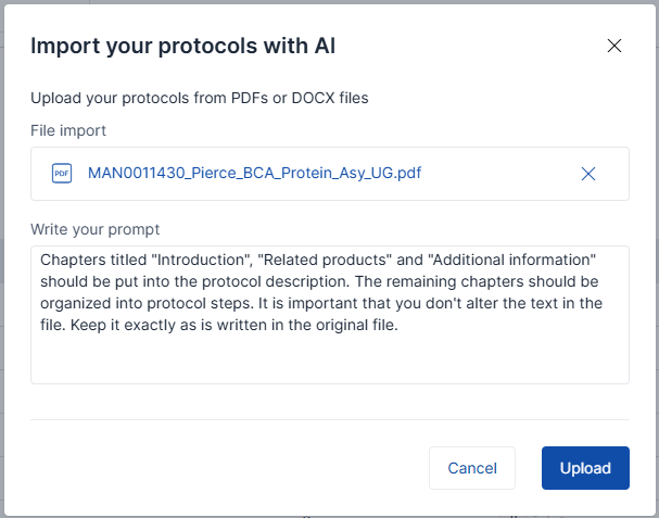 The Import with AI marks a significant step forward in integrating smart automation into digital lab management systems. By enabling researchers to transform existing procedural documents into structured protocol templates using natural language prompts and AI models, the feature helps bridge the gap between legacy SOPs and modern lab workflows.
