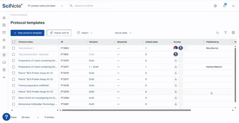 The Import with AI is an AI-assisted protocol parsing feature that automatically extracts content from PDF documents and transforms it into editable protocol templates within the SciNote ELN environment. This feature uses AI-powered parsing technology to interpret textual content and generate structured protocol inputs that can be reviewed, edited, and reused as part of your digital research workflows.