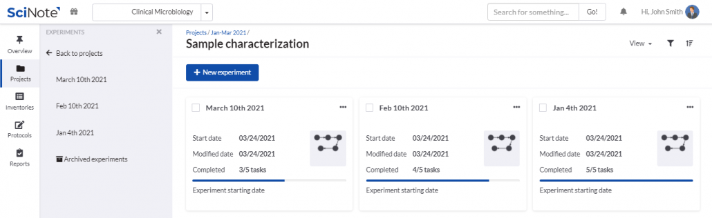 Each experiment within the project represents an on sample or a batch of samples and can be named with a date when the experiment started (e.g. 20th Feb 2021).