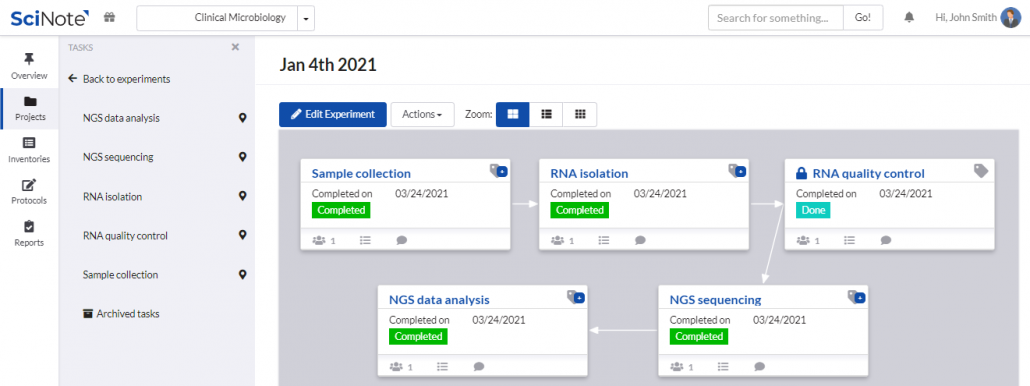 Each experiment contains a simple workflow of e.g. 5 tasks i.e. 4 SOPs required to process the sample via the method you use (team you’re in).