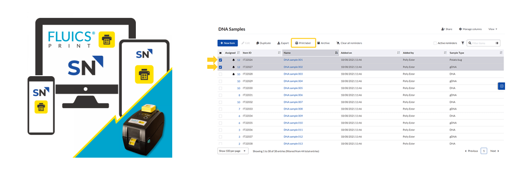 FLUICS Print is a service offered to for SciNote users to print smear-proof cryo labels with QR codes directly through the cloud. Unbox the printer, connect it to the internet with a LAN cable and start printing your labels in your lab. Barcoded labels can be scanned to directly access sample properties and track samples throughout the experiments.