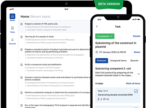 Download the SciNote ELN mobile app (beta) for iOS and Android devices in app stores to access your tasks on your smartphone or tablet.