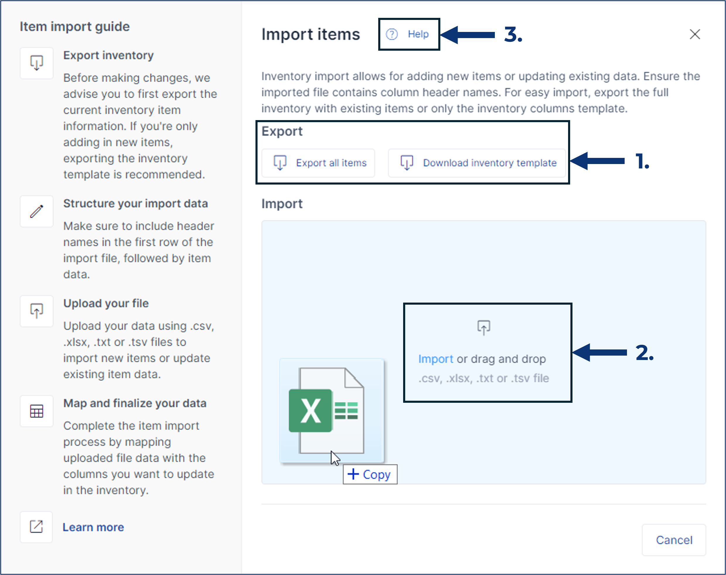 - A Download inventory template button exports a file with all the column headers from your selected inventory. Using this template, simply add your item data to this file, and it will already have the structure needed for a seamless import.