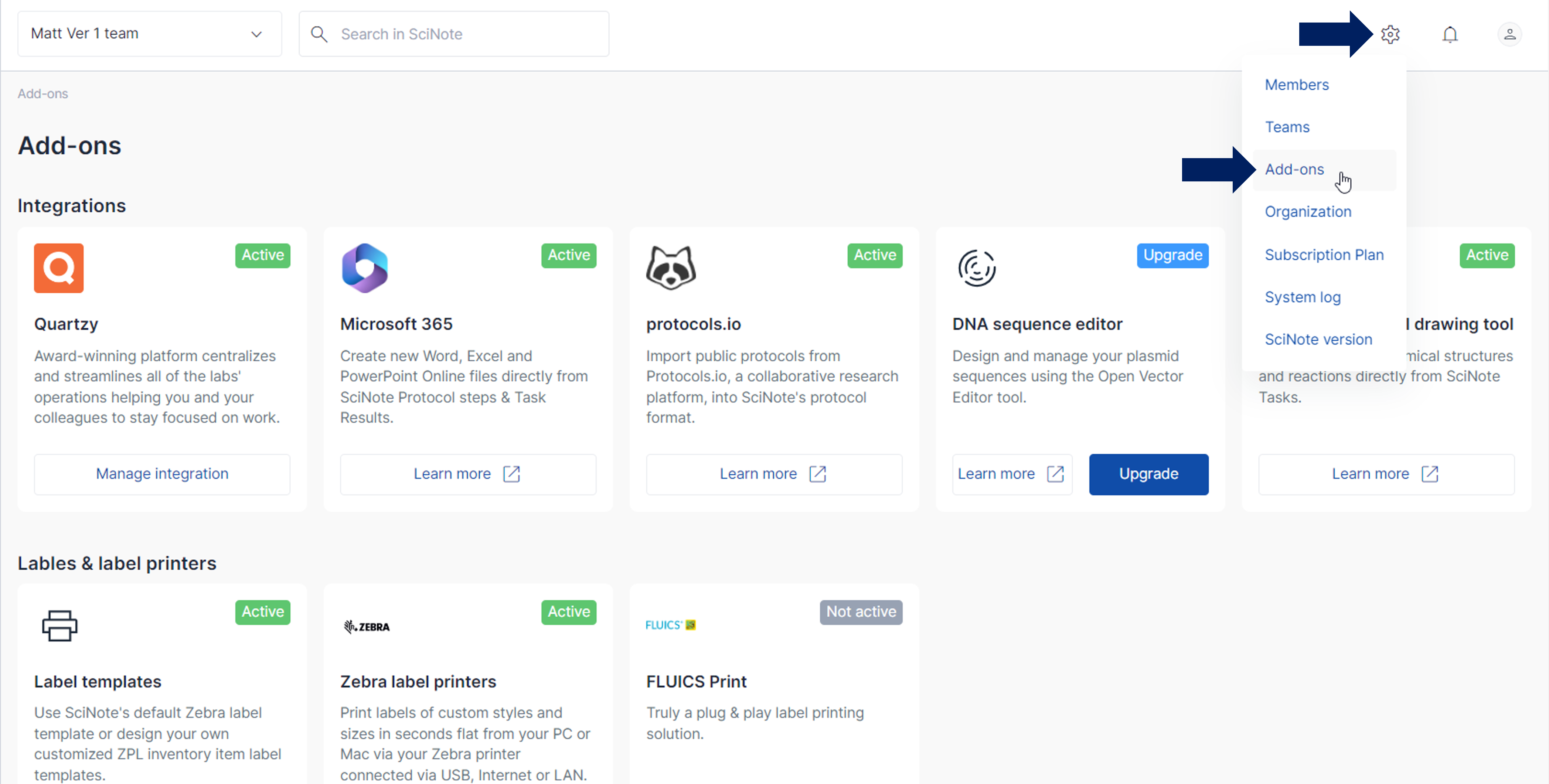 You can manage add-on settings for those that require it (if you have the permissions to manage them) along with the materials to read more and an “Upgrade” button for add-ons that are not yet enabled in your SciNote account.