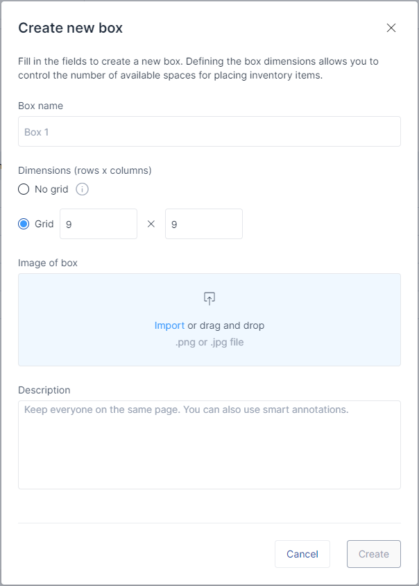 For a grid box, you define the number of rows and columns it has. This is then reflected by the visual representation of the box positions and allows more precise placement of inventory items.